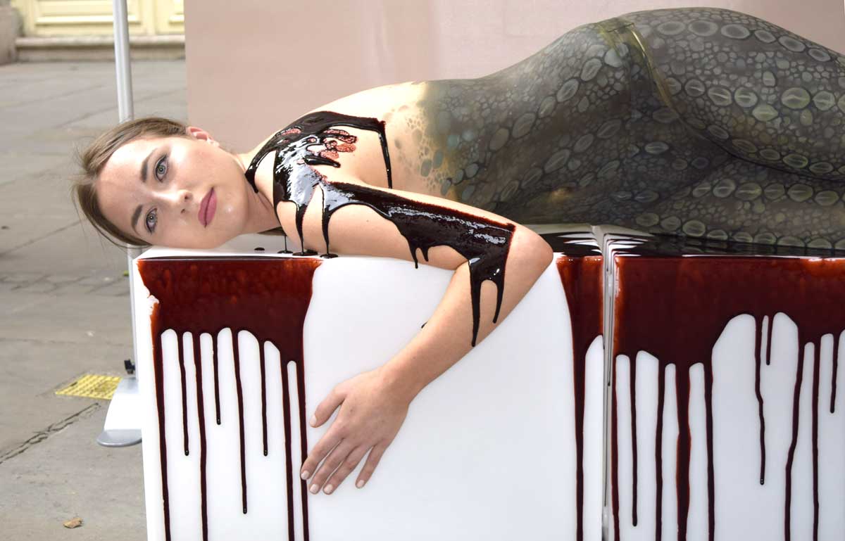 Naked, body-painted like a crocodile and lying in a pool of “blood”, Harriet, a PETA supporter, made sure nobody could miss her protest. She says: