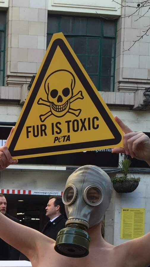 Of course, an even better reason to shun fur is to prevent cruelty. Animals on fur farms are driven insane by boredom and frustration in their filthy wire cages before being killed for their skins. The gas masks used in this protest are also a reminder of how so many of them are murdered by being shoved into a box and poisoned with noxious fumes.
