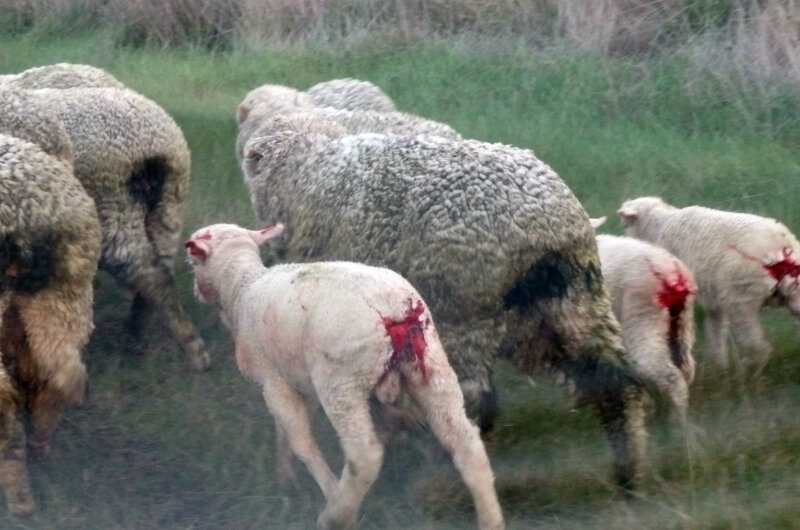 In its exposés of the international wool industry, PETA has revealed that gentle sheep are punched in the face, jabbed with electric clippers, slammed to the floor, and stamped on by impatient workers. As Joaquin mentions in his interview, shearers are often paid by volume, not by the hour, which encourages fast, violent work that can lead to gaping wounds on sheep’s bodies. Workers then stitch up the wounds – without giving the animals any painkillers.