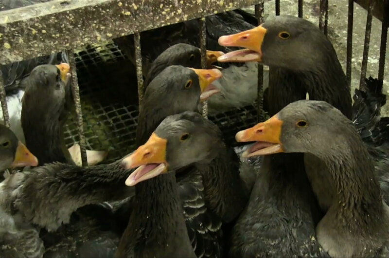 Not only do birds endure the agony of force-feeding, they also live in squalid, cramped conditions. As their livers swell in the final weeks of their lives and press against their lungs, they struggle even to breathe. PETA’s eyewitness investigation of the industry helped show the public how cruel foie gras production really is.