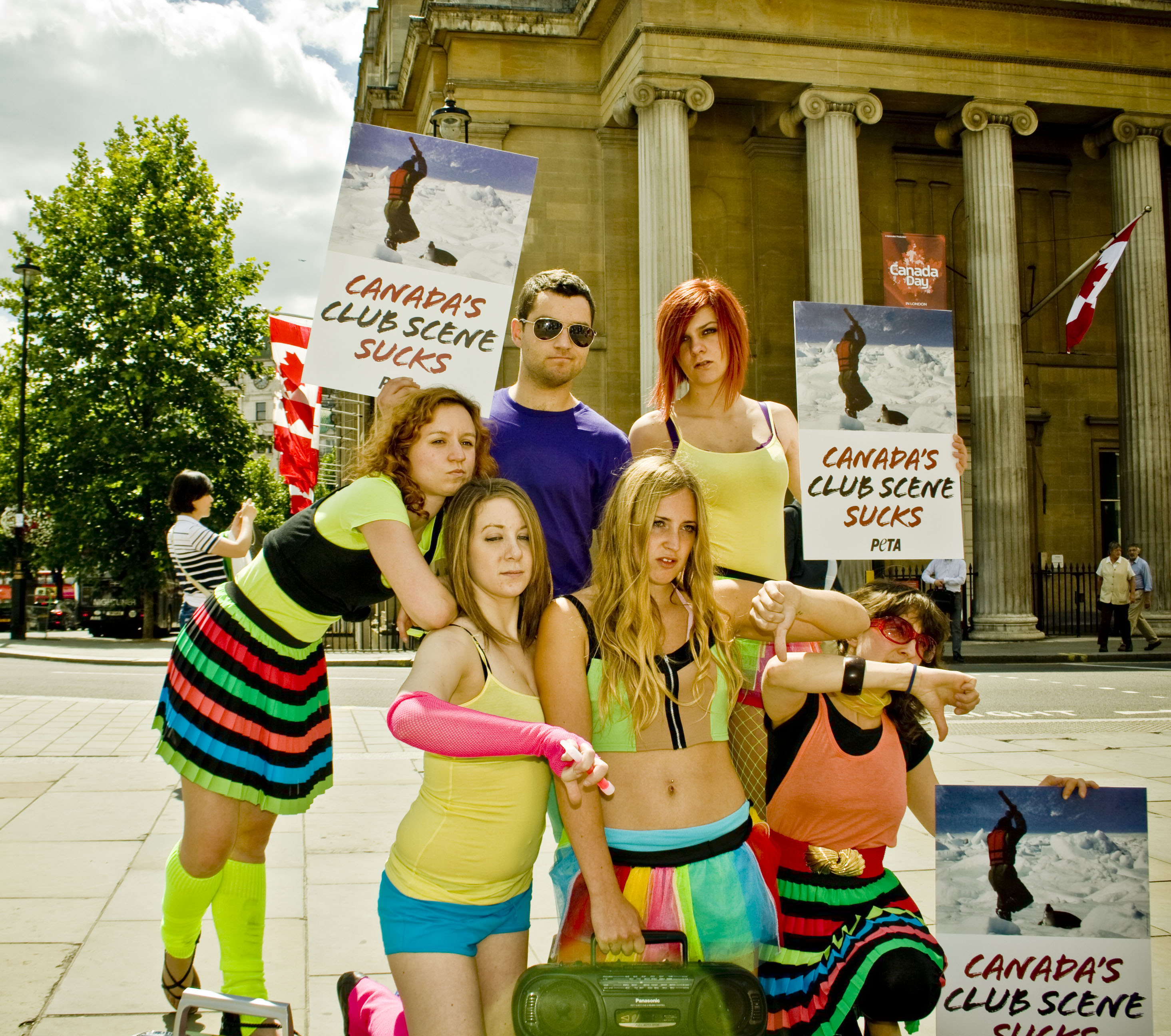 Wearing loud costumes and holding signs that have graphic photos from Canada’s annual baby-seal slaughter and that read, “Canada’s Club Scene Sucks”, PETA “ravers” crashed the festivities at the biggest Canada Day celebration held outside Canada’s borders at Trafalgar Square today. Their point? Clubbing and shooting baby seals to death is nothing to celebrate.