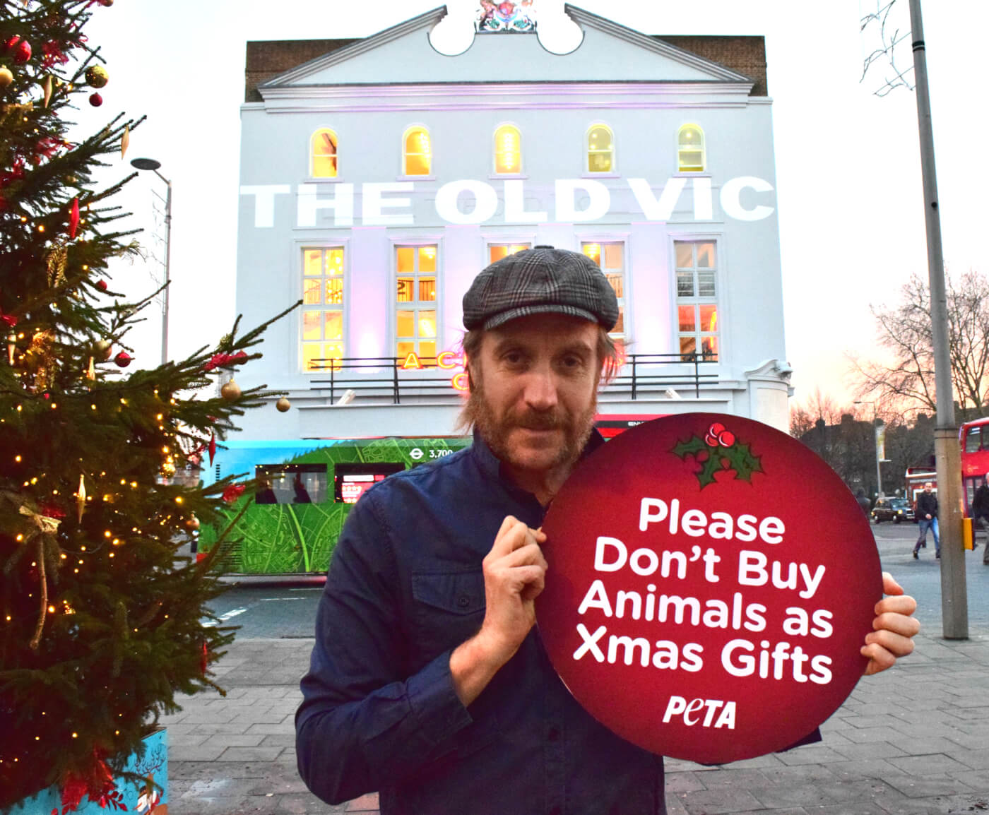 Actor Rhys Ifans, who is starring as Scrooge in The Old Vic’s A Christmas Carol, nipped out of the theatre on Tuesday afternoon for a festive photo opportunity with PETA.