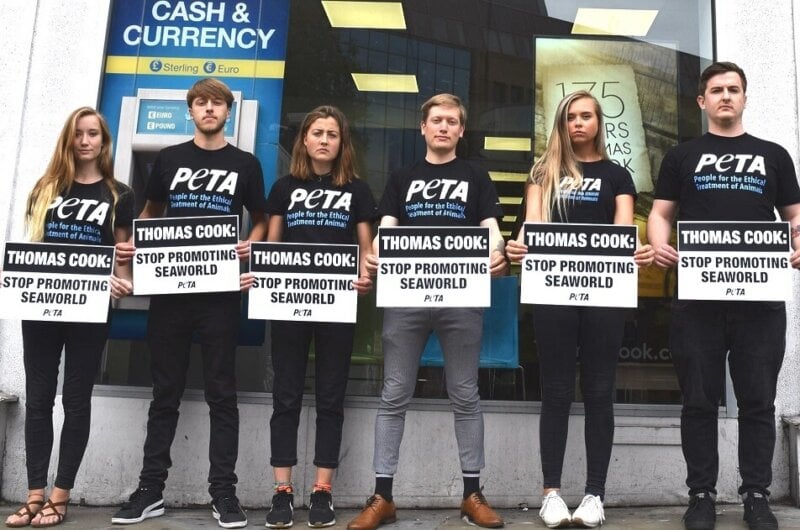 While the demonstration was taking place outside, two representatives of PETA US attended the meeting, where they demanded to know when Thomas Cook would finally drop its promotions of SeaWorld. PETA US recently became a shareholder in the company so that its representatives could be present at the meeting and address the board officially.