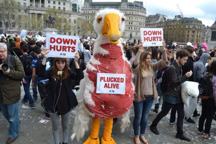 A recent PETA exposé of the down industry in China shows workers ripping geese’s feathers out – leaving open, bloody wounds – while the birds are fully conscious. Dead birds were found decaying in crates and ponds or tossed outside like rubbish.