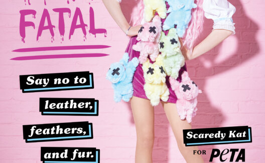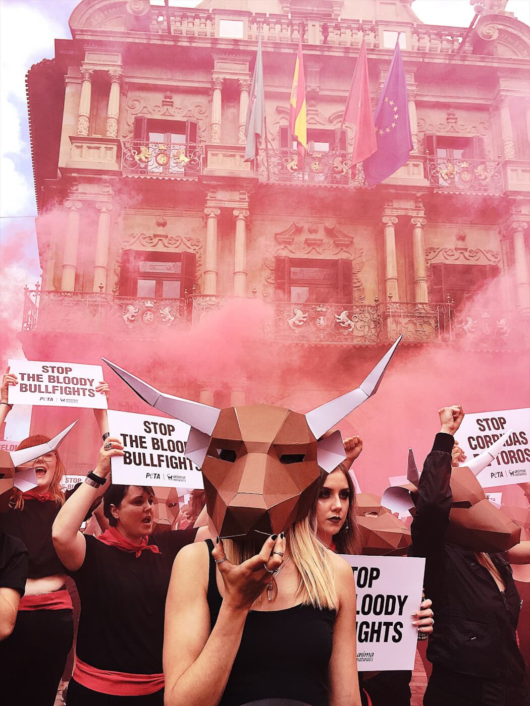 Today, more than 100 activists marched to the beat of drums towards the Plaza Consistorial in Pamplona, Spain, holding signs proclaiming, “Stop the Bloody Bullfights.” The supporters of PETA affiliates and Spanish animal-protection group AnimaNaturalis – half of whom were “runners” and half of whom were “bulls” – shot blood-red flares into the sky to call for an end to the city’s yearly torment and killing of bulls at the San Fermín festival’s hideously cruel Running of the Bulls event.