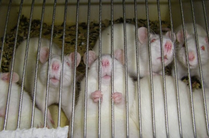 In Italy, experimenters injected 154 male mice in the upper lip with a chemical known to cause them intense pain in order to investigate how morphine and ibuprofen would affect their pain response. The mice were confined to an observation box for 45 minutes to see whether they would groom the injection area, a sign that they’re experiencing pain. They were then administered different pain relievers to see whether they would stop grooming. To assess how pain affected their movement, the already distressed mice were placed on a suspended, rotating tube called a rotarod – forcing them to keep moving, clinging to the revolving rod, to avoid falling onto a hard platform. Finally, each mouse was gassed to death.