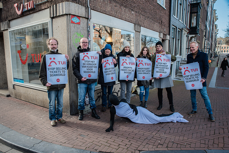 From Brighton to Amsterdam, PETA and our affiliates coordinated a series of demonstrations outside TUI locations urging the company to stop selling tickets to SeaWorld. This was the second such day of action – the first was held in December.