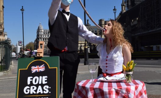 In support of our friends at PETA India, PETA UK members dressed up and made a plea for animals’ lives outside the High Commission of India in London today. In protest of Air India’s about-face on its ban on transporting animals to laboratories, volunteers reminded Air India officials that they are every bit as guilty of the pain, suffering and death that animals are subjected to as the experimenters who wield the poisons and scalpels.