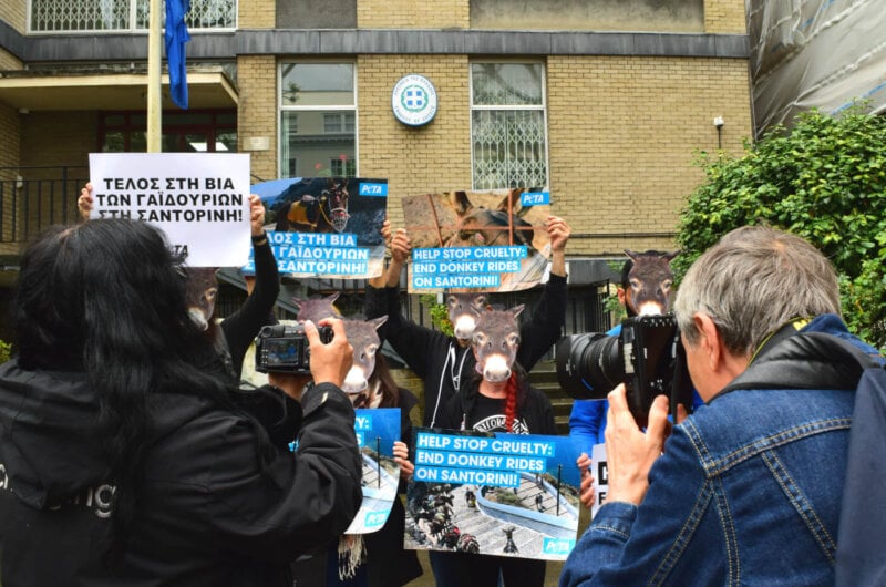 A coalition of authors from across the UK and Europe has signed a letter from PETA and our international affiliates asking the Greek agriculture minister to ban cruel donkey and mule “taxi” rides in Santorini.