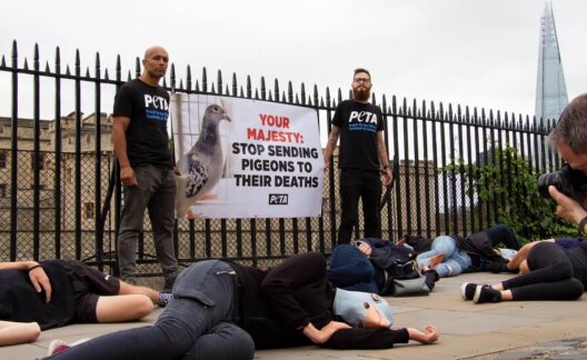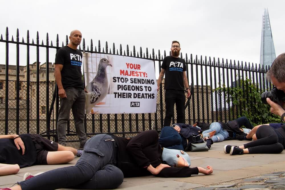 Today, wearing pigeon masks and chanting, “Pigeon racing kills,” eight PETA supporters – each representing one of the pigeons sent by the Queen to the South African Million Dollar Pigeon Race (SAMDPR) every year – gathered in front of the Tower of London and, together, dropped “dead”.