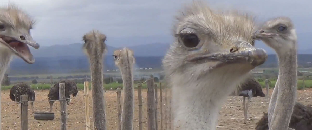 One-year-old ostriches are transported by lorry to abattoirs, where workers turn them upside down in a stunner, slit their throats, and pluck them.