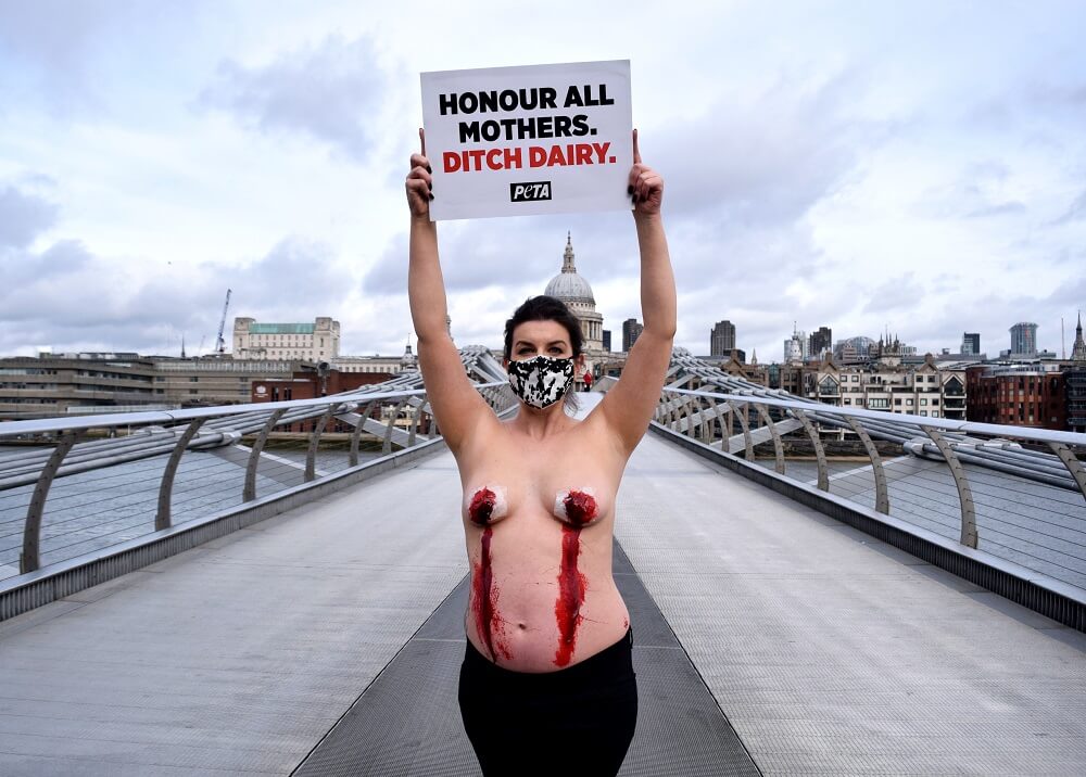 With her nipples caked in “blood”, a pregnant PETA supporter took to Millennium Bridge today – on Mother’s Day – to highlight the plight of mother cows in the dairy industry.