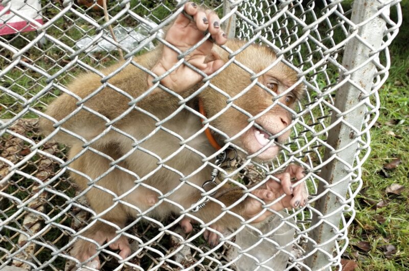 In April, PETA Asia and WFFT teamed up to rescue another monkey, named Odd. He was found with an infected wound caused by a tight metal ring around his neck that had become painfully and deeply embedded in his skin, and he was also suffering from a lung infection. He received urgent veterinary care.