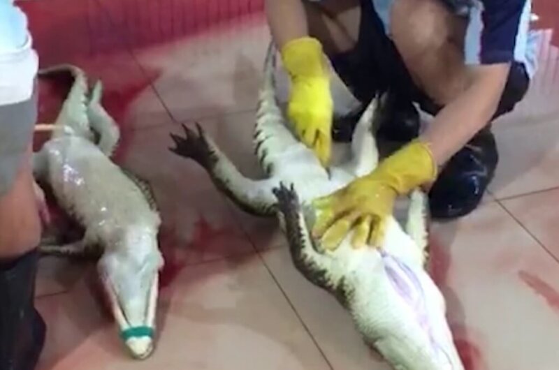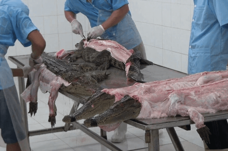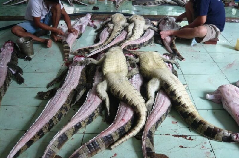Alligators are commonly kept in fetid water inside dank, dark sheds until workers hack their necks open and shove a metal rod up into their brains, often while they’re still conscious.