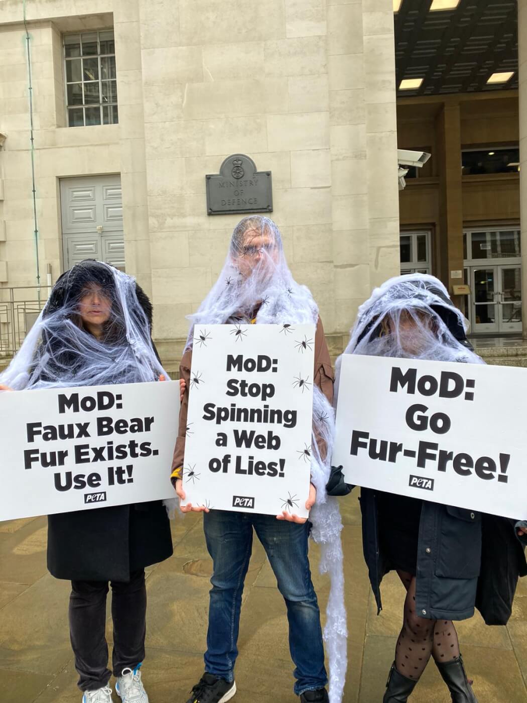 Today, PETA “spiders” were outside the Ministry of Defence’s (MoD) headquarters in London to highlight the web of lies that defence minister Ben Wallace has spun around the suitability of the faux bear fur that we have helped create to replace the bearskins used for the Queen’s Guard’s caps.