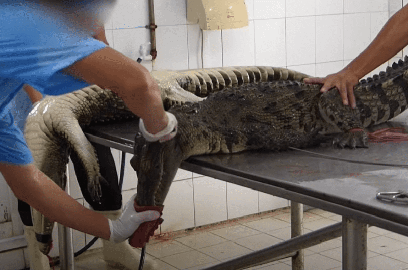 In the US and Africa, investigators observed that alligators are packed together in fetid water and dank, dark sheds. Workers crudely hacked open their necks and shoved a metal rod into their heads in an attempt to scramble their brains. Some animals were still conscious and kicking minutes later. Their skins were then exported to Europe to be made into “luxury” items.