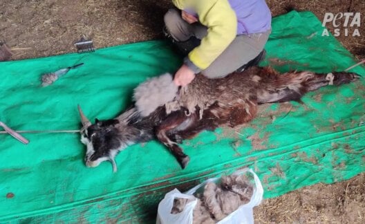 A recent PETA Asia exposé showed that pythons reared for the fashion industry are confined to dirty wire cages, in which they spend their lives unable to stretch out to their full length. Then, workers close off their mouths and anuses with rubber bands, insert a hose into a hole cut into the head or the tail, and inflate the snakes with an air compressor, causing them considerable pain as they suffocate to death.