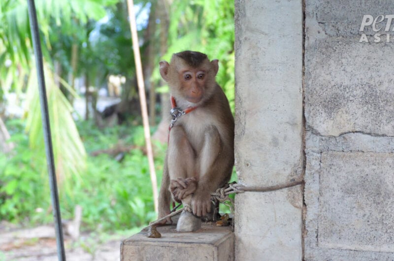 PETA Asia’s investigators found that when the monkeys aren’t being forced to pick coconuts or perform in cruel, circus-style shows for tourists, they’re kept in cages or chained by the neck to old tyres and boxes.
