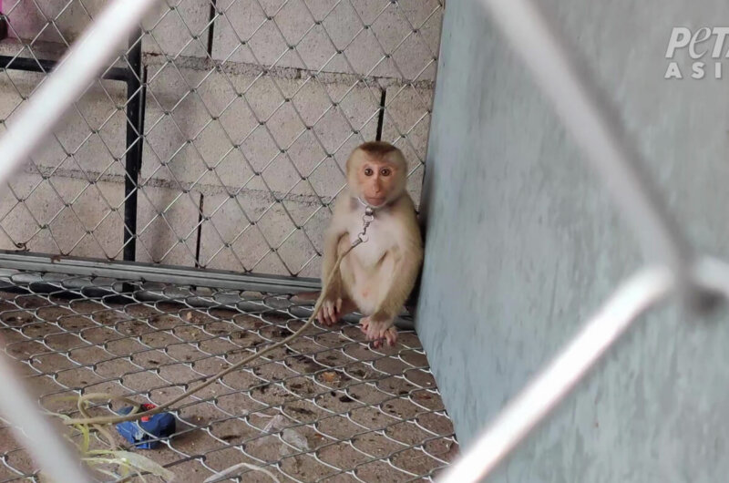 Investigators found that when the monkeys aren’t being forced to pick coconuts or perform in cruel, circus-style shows for tourists, they’re kept chained by the neck to old tyres and boxes.