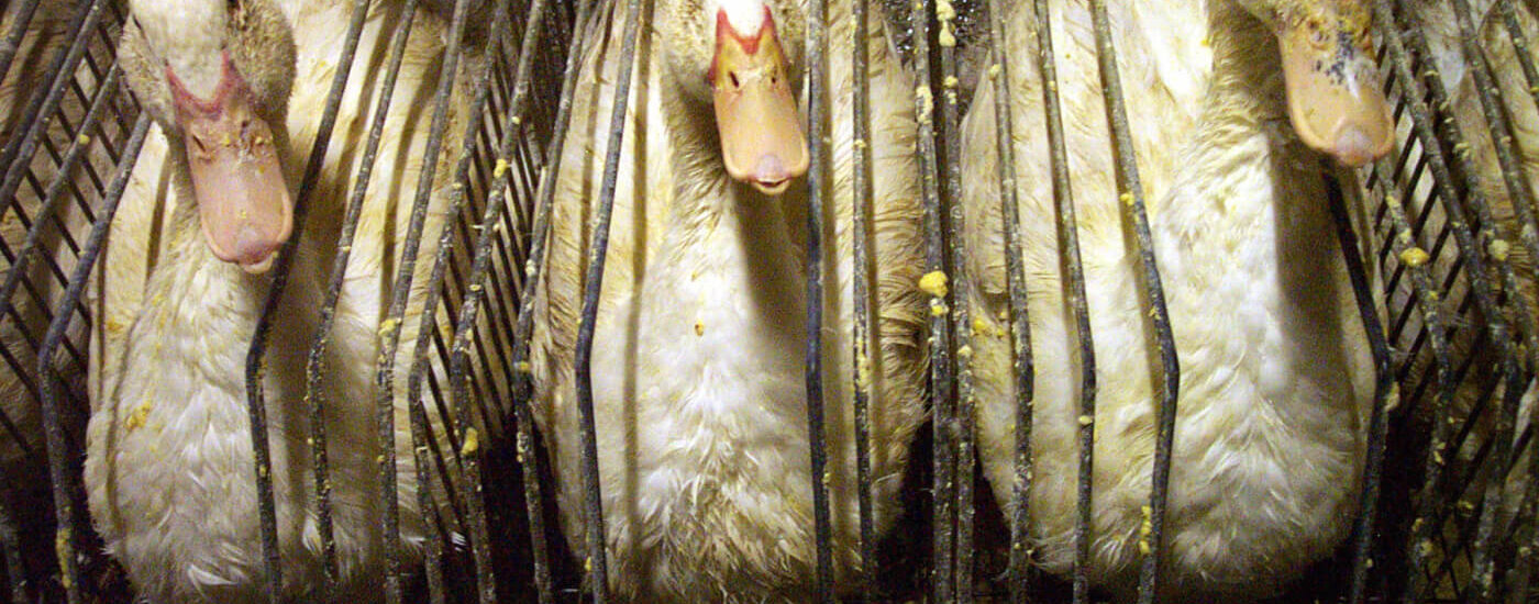 Their engorged livers press against other organs, including their lungs, causing them to pant constantly. The birds are often left to languish in cramped metal cages or pens, coated in dirt and vomit and covered with sores.