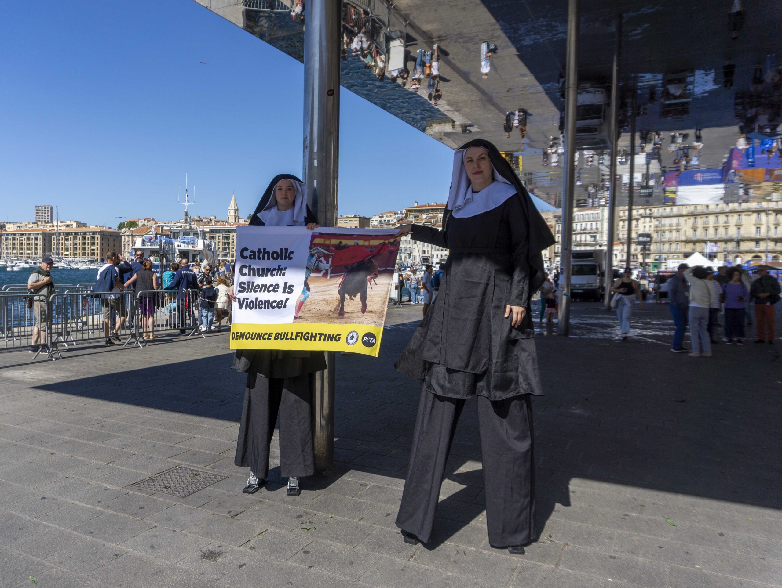 PETA supporters perched on stilts and dressed as nuns were in Marseille today, together with animal advocacy group Catholic Concern for Animals, urging the visiting Pope Francis to publicly condemn the cruel torture of bulls.