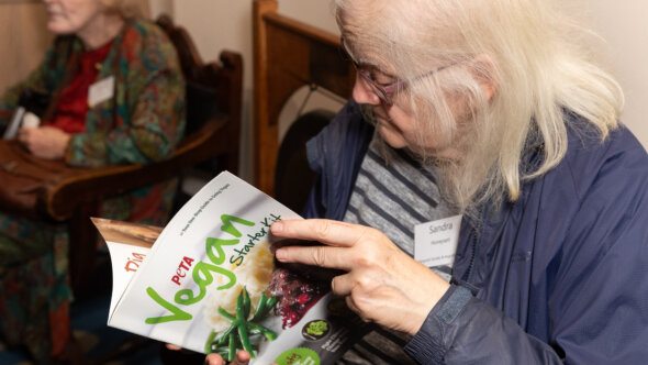 PETA’s senior staff wowed the crowd with tales of our recent victories, which included sparing hundreds of animals agonising tests that had been wrongly mandated by the European Chemicals Agency, persuading Moonpig to banish all cards featuring chimpanzees, and convincing HelloFresh, the UK’s largest meal kit company, to remove all Thai coconut milk products from its supply chain – the only way to ensure it’s not a product of monkey labour. The audience was also treated to PETA’s foray into the “dark arts” when we screened clips of our award-winning Red River Farm short and our heartwarming Toby the Turkey advert.