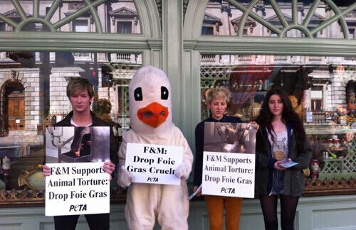 PETA supporters placed 498 “blood”-splattered bear cut-outs on massive Union Jack flags outside the Ministry of Defence (MoD) building in Whitehall. The move was to protest the MoD’s support of the slaughter of Canadian black bears, whose fur is used to make the caps worn by the King’s Guard, and to urge the new defence minister, Grant Shapps, to spare bears by switching to faux fur.