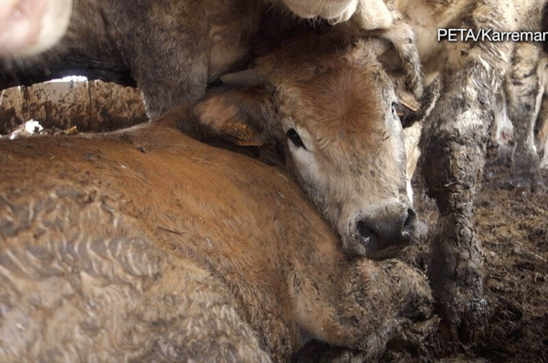 Because cows’ skin is the most economically important co-product of the meat industry, buying leather directly contributes to factory farms and abattoirs – and all the cruelty they involve. Animals raised on filthy, crowded farms are often caged and deprived of all that is natural and important to them, such as foraging for food and raising their young. Many are subjected to horrific mutilations – their teeth, tails, and testicles may be cut off without any painkillers. Female cows are repeatedly impregnated by artificial insemination, and their terrified babies are torn away from them shortly after birth. At the abattoir, many cows are still conscious and able to feel pain when their throats are cut. Luxury brands often sell “calf leather” or “calfskin”, which means the terrified babies being torn away from their mothers may be killed in this way, too.