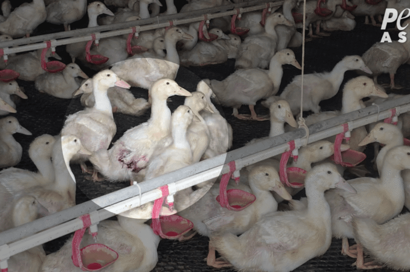 The footage shows that ducks are forced to live in filthy sheds and on barren, faeces-filled lots. Many suffered from bloody wounds, and some were unable to stand. At a slaughterhouse, a worker violently grabbed birds and hung them upside down in shackles.