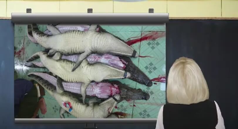 A PETA Asia investigation into farms in Vietnam that supplied Louis Vuitton among other brands revealed that workers cut crocodiles’ necks and drove a metal rod down their spine before butchering the animals while they were still alive.