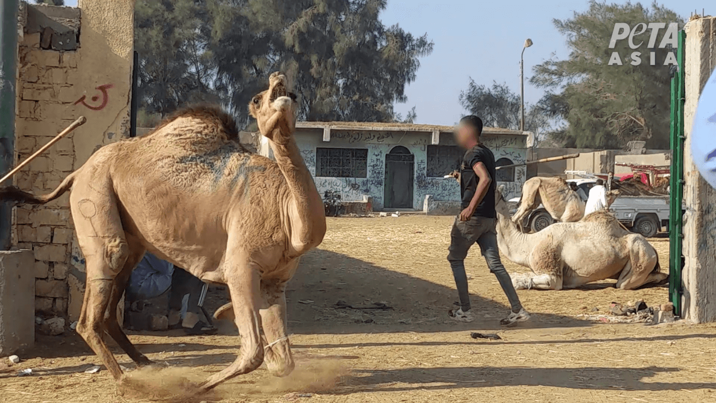 And even with better veterinary care, horses and camels will still suffer. PETA’s latest mini documentary shows that handlers violently whip exhausted horses in front of the tourists they’re forced to carry in the blistering sun. When camels are no longer considered “useful”, they’re often hauled to a slaughterhouse, where workers slit their throats while they’re still conscious.