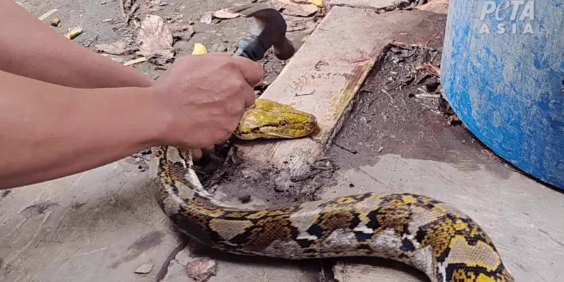 As documented in the video, some struggle helplessly as their skin is torn off, and many pythons are even skinned alive.
