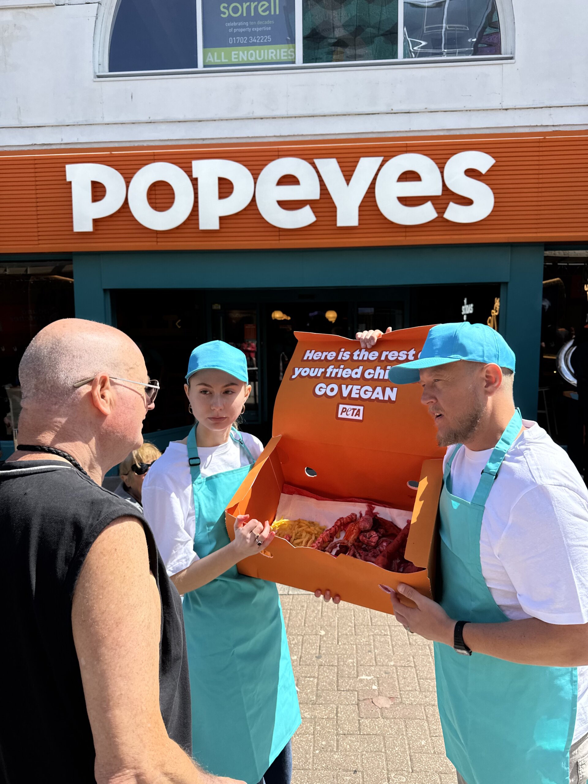 What’s hiding behind a chicken takeaway? A pair of PETA supporters dressed as Popeyes employees crashed the chain’s opening in Southend. Their giant “takeaway box” revealed a grisly sight: