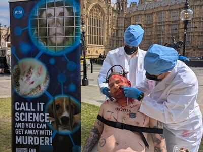 The demonstration took place in front of a banner with a message reading, “Call it science, and you can get away with murder!” instructing the government to end experiments on animals. This is the latest action in PETA’s campaign asking for a government-led roadmap to phase out all experiments.