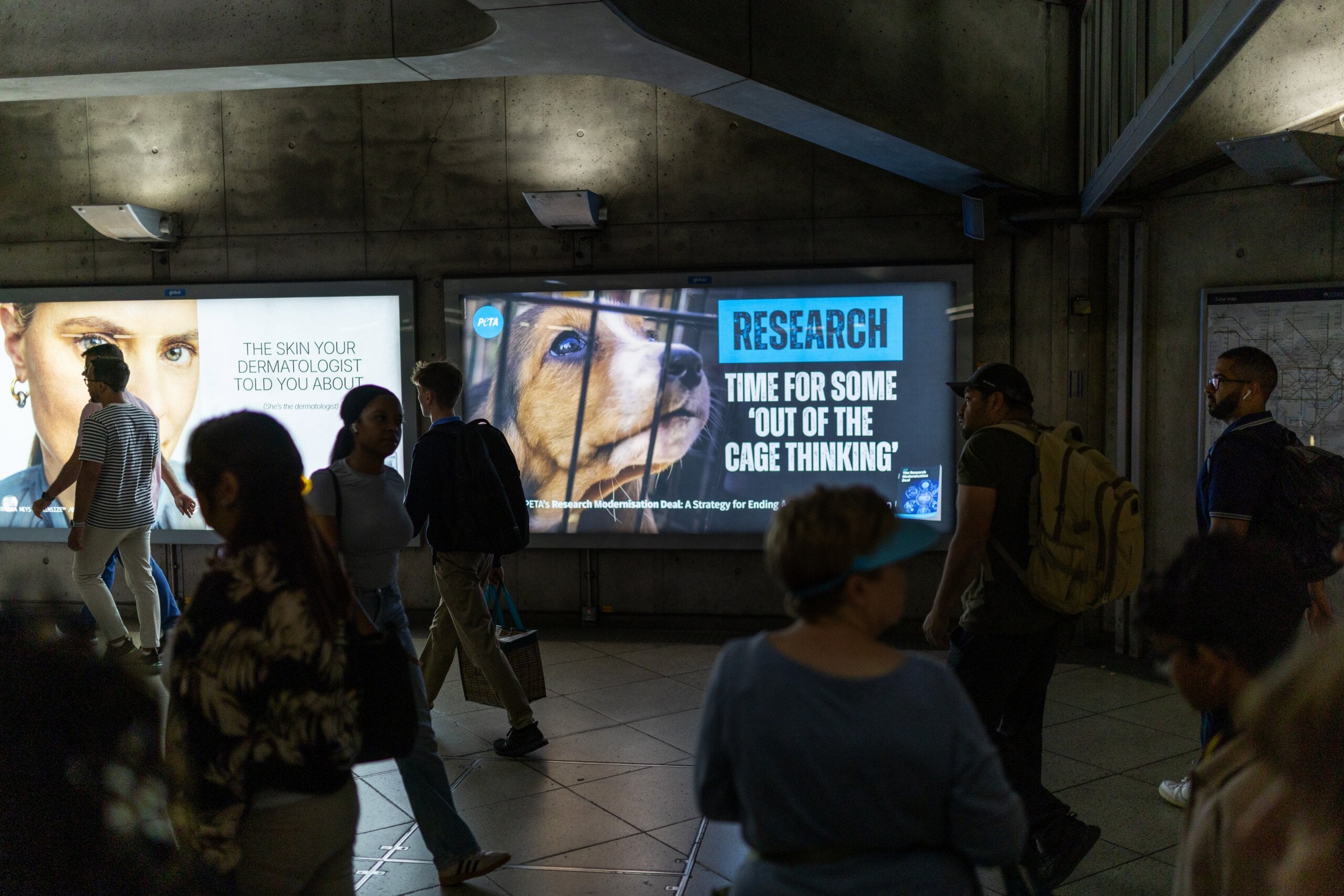 The pleading pup – strategically placed just around the corner from the Houses of Parliament and Downing Street – is part of PETA’s campaign calling on the government to adopt its Research Modernisation Deal, a strategy to end animal testing and pivot to human-relevant research methods.