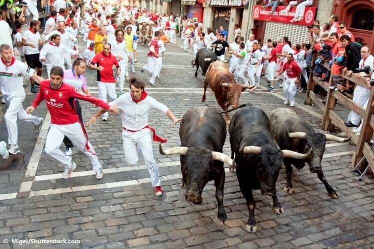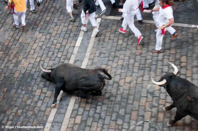 During the San Fermin festival in Pamplona, the bulls are chased through the city streets, where they risk crashing into barriers and walls, falling and breaking their legs, or colliding with each other.