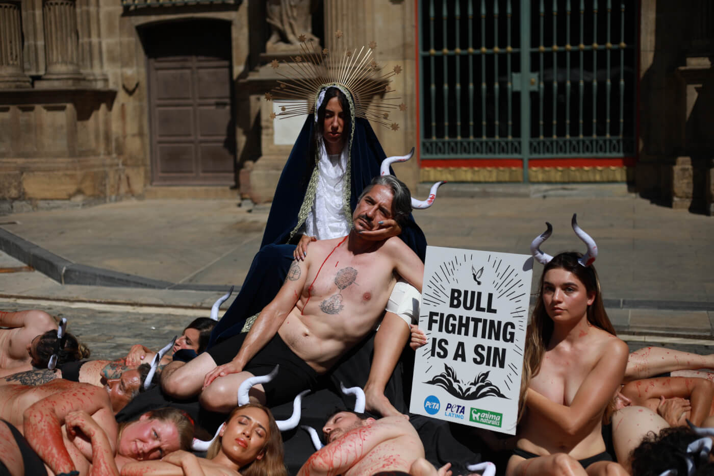 Ahead of the Running of the Bulls and 60 subsequent bullfights at the San Fermín festival in Pamplona, Spain, animal advocates from PETA and Spanish animal protection group AnimaNaturalis joined forces to protest these bloody spectacles. Animal allies recreated the Pietà – Michelangelo’s depiction of the Virgin Mary cradling the body of Jesus Christ – but instead of Jesus, she was mourning a “dead bull” as dozens of other “bloody bulls” lay lifeless in a pile around them, wearing nothing but black underwear, and “horns”: