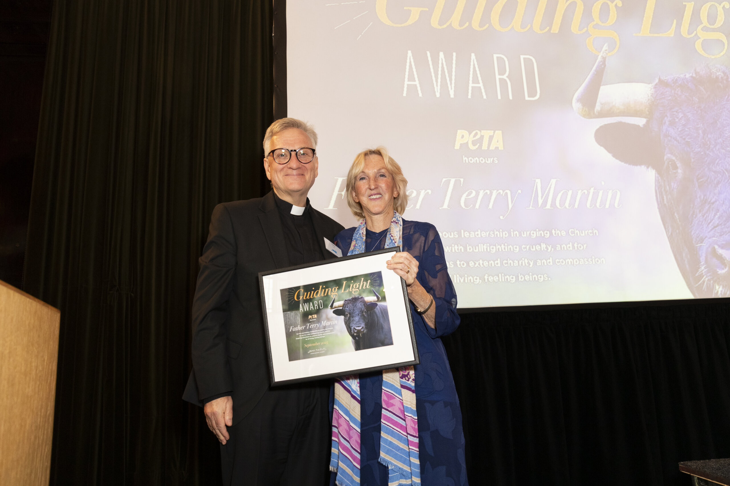 The event also honoured those who embody the spirit of change. Father Terry Martin, a Catholic priest from West Sussex, received PETA’s Guiding Light Award for his tireless work helping fellow Christians recognise that animals are not commodities. His journey from meat-eater to vegan advocate was inspired by the realisation that the animals on his plate were as sentient as his beloved dog, and now fellow vegan, Pepe. Father Terry’s work challenging the Roman Catholic Church’s complicity in bullfighting, through opinion pieces and appeals to the Pope, shows that change is reaching even the most traditional institutions.