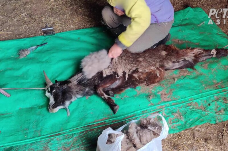 Goats farmed for their fleece rarely get a moment’s peace. As soon as their soft under fleece grows long enough, they’re violently grabbed, wrestled to the ground, pinned down and roughly brushed to pull the delicate hair from their sensitive skin.