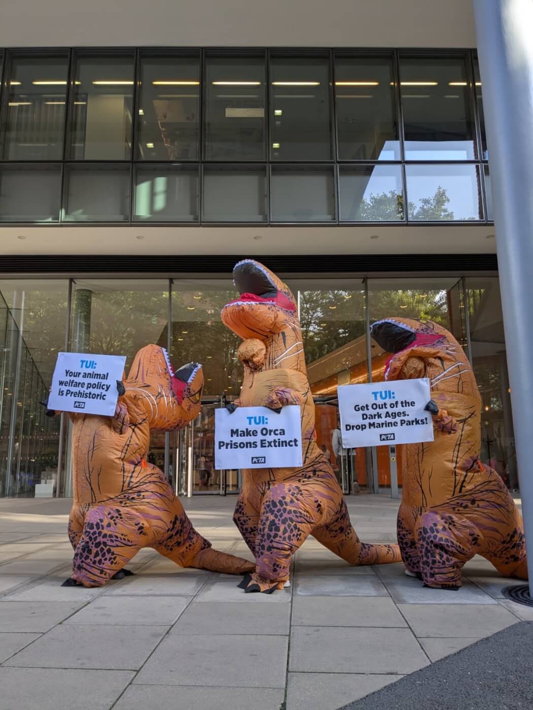 After a baby orca was born at Loro Parque, a cruel marine park in Tenerife, Spain, a PETA supporter and her baby dressed as orcas outside the TUI Holiday Store in Cardiff to blast the travel company for selling tickets to the abusement park.