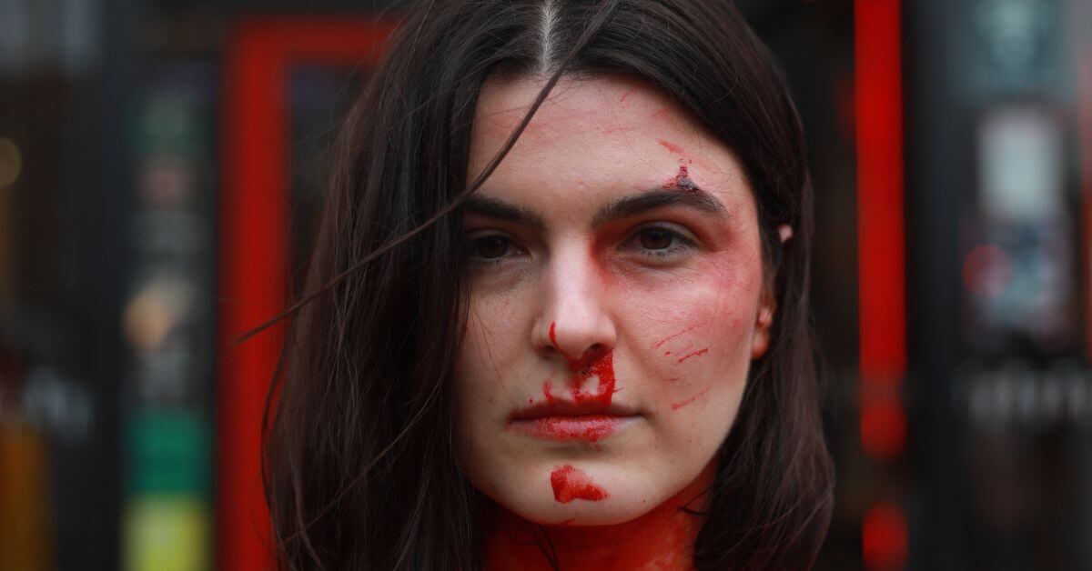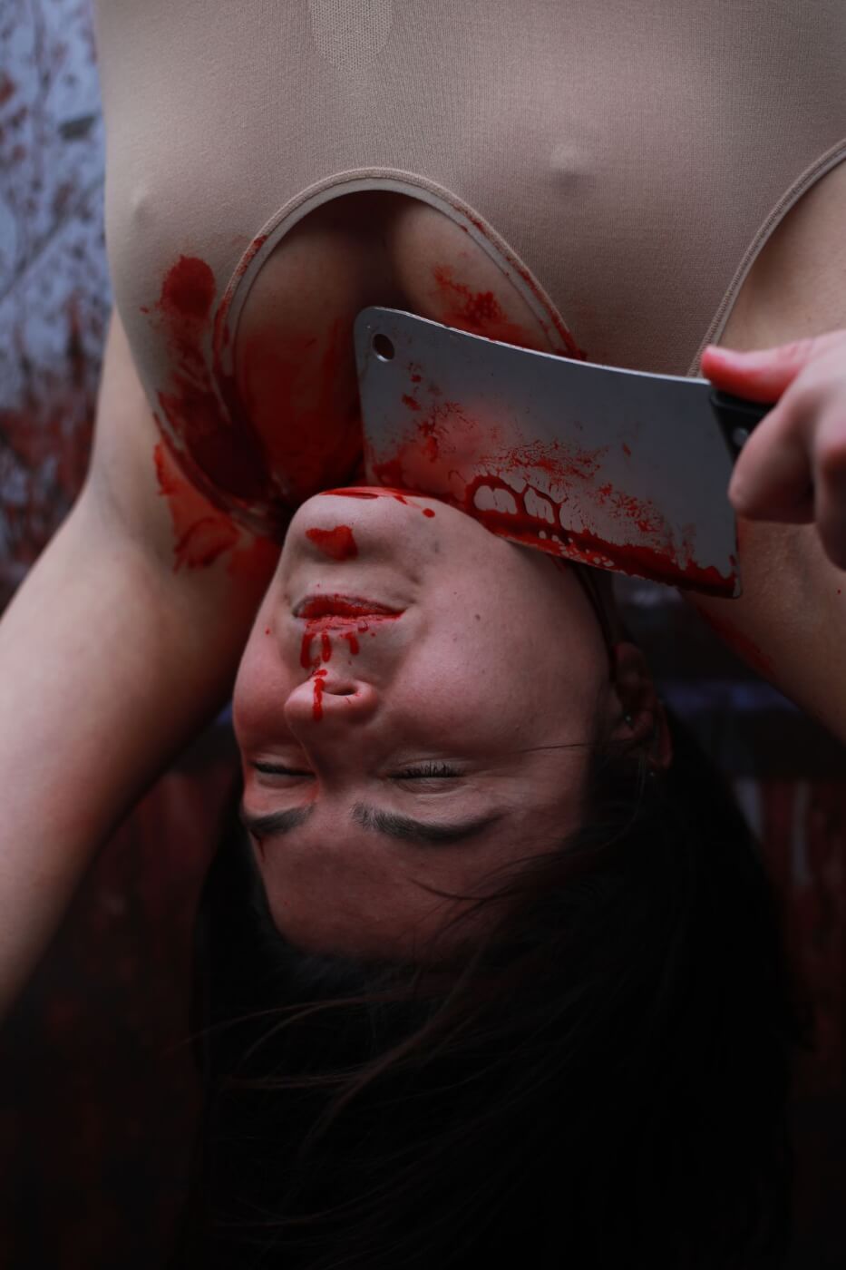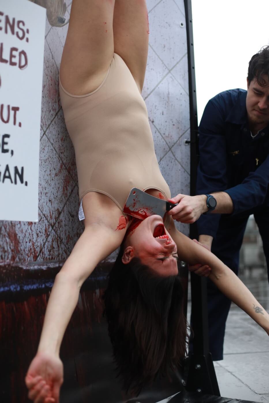 Covered in ‘bruises’ and ‘blood’, we had our necks hacked at by a ‘slaughterhouse worker’ with a prop knife – prompting a shocked reaction from passersby.