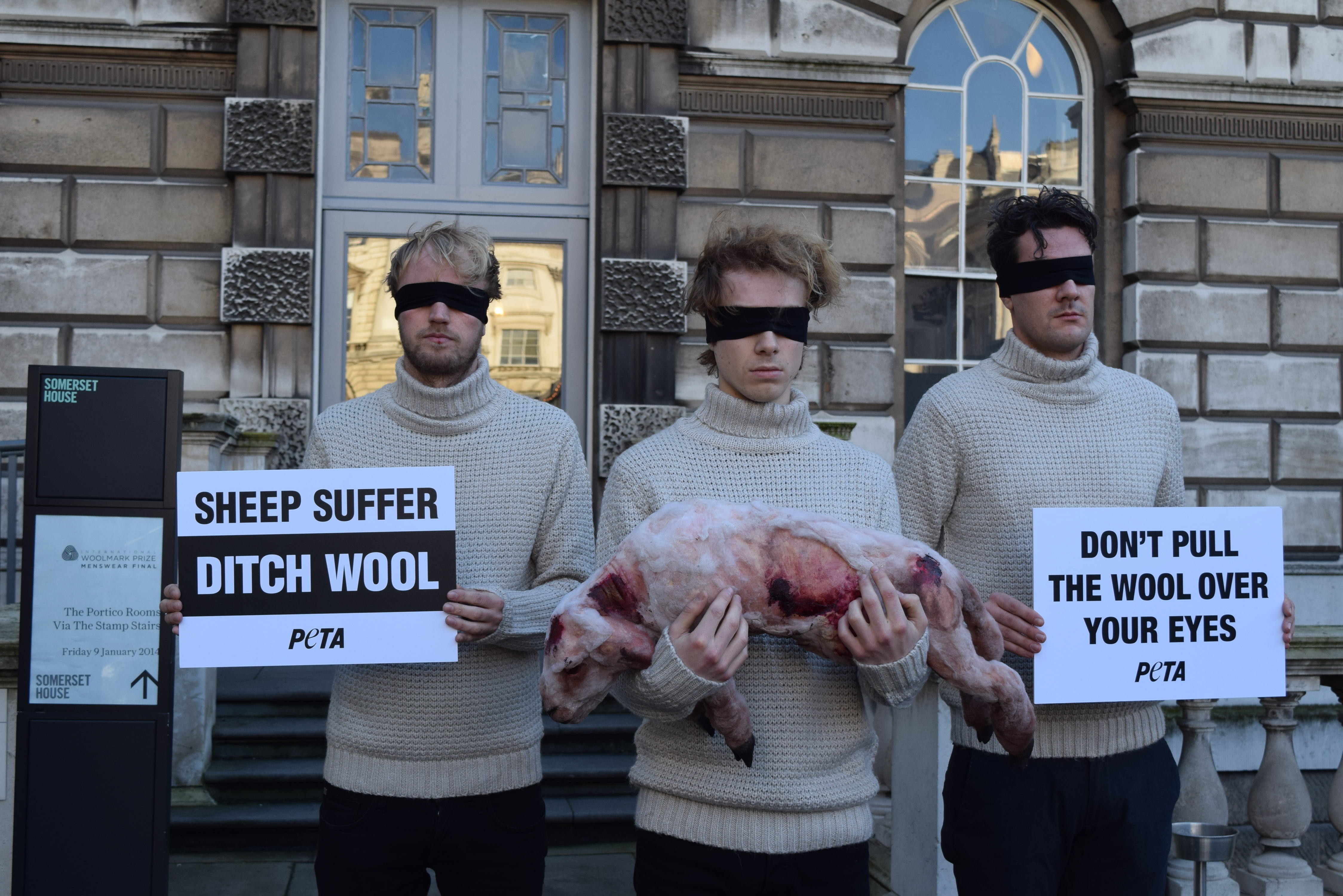 Three vegan models in faux-wool jumpers and blindfolds stood tall at Somerset House this morning outside Woolmark’s menswear show, as part of “London Collections: Men”, to protest the wool industry’s cruelty to sheep.